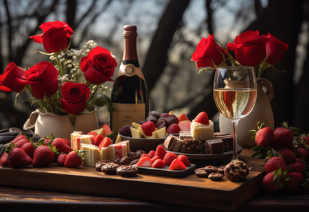 Romantic Outdoor Picnic with Champagne Bottle, Roses, and Heart-Shaped Sandwiches, Concept of Love, Celebration, and Valentines Day. Valentine's Day.