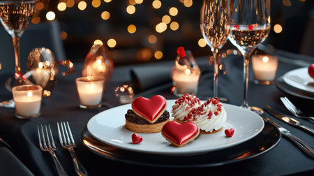 A luxurious Valentine dinner setup with heart-shaped desserts and candlelight