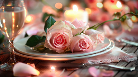 A table is set for a romantic dinner with two pink roses nestled on a white plate, surrounded by candlelight. The soft, warm glow creates an intimate atmosphere.