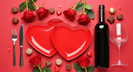 Romantic table setting with red heart plates, roses, wine bottle, chocolates, cutlery, and empty glass on matching red background.