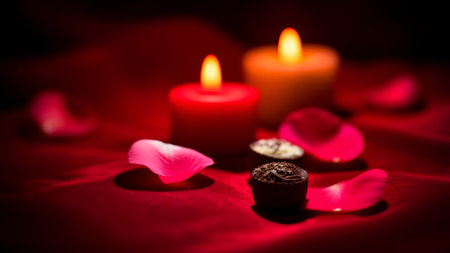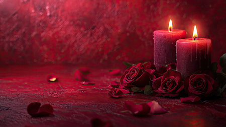 Romantic ambiance with glowing candles and fresh red roses scattered on a textured red background, styled with a warm glow.