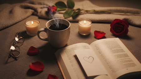 A romantic table setting featuring a vintage calendar, fresh roses, and warm heart decorations. Perfect for love celebrations, anniversaries, or special moments.