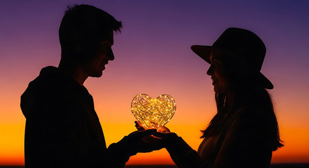 Young couple in silhouette exchanging a gift in a romantic moment, standing in front of shimmering Christmas lights in the background, conveying concepts of generosity, love, and holiday celebration