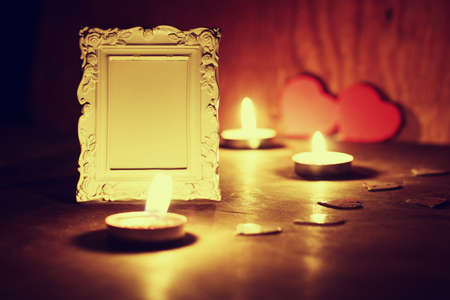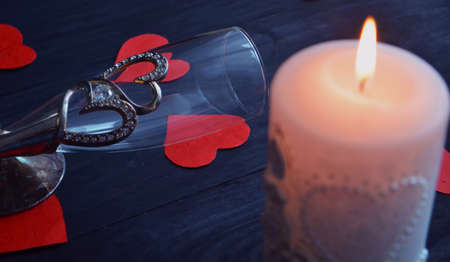 Burning candle, romantic atmosphere. On a wooden board. Valentine's Day. Valentine