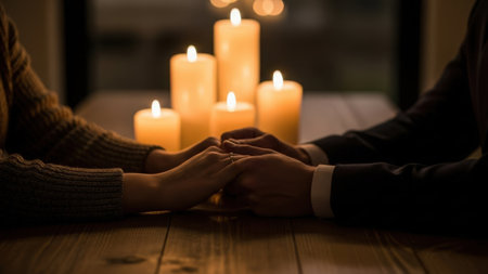 Intimate moment between two people soft candlelight setting hands touching close relationship engagement ring warm atmosphere