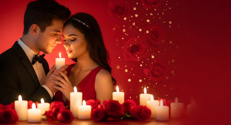 Romantic couple with candles and roses on red background. Valentine's day concept