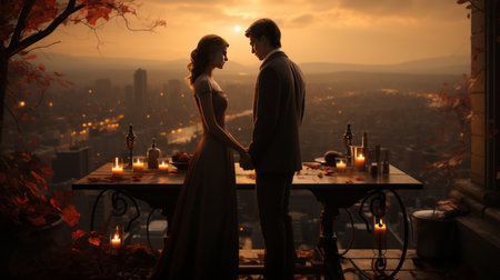 A couple is depicted enjoying a romantic dinner, illuminated by candlelight. The scene features a softly lit table set against a backdrop of twinkling city lights under a dark sky. This image evokes feelings of intimacy and celebration, suitable for various editorial and commercial applications.