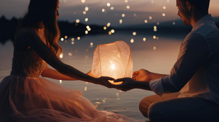 A couple sitting together, embracing, smiling, enjoying a romantic night generated by artificial intelligence