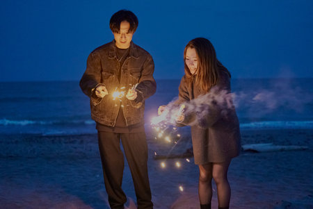 Back view of young beautiful happy couple holding sparkles against the sea.
