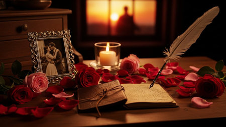 A romantic scene unfolds on a wooden desk, featuring an open notebook with a quill pen poised to write. A framed captures a couple in a loving embrace. Scattered red and pink rose petals surround a lit candle in a glass holder, casting a warm glow. In the background, a window reveals a sunset with a silhouetted figure, adding to the nostalgic and intimate atmosphere.