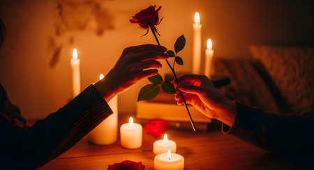 Close-up of two hands exchanging a single red rose over a table illuminated by warm candlelight. The scene conveys deep romance, love, and intimacy, perfect for Valentine's Day.