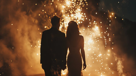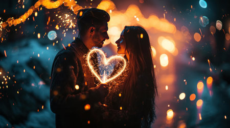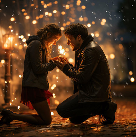 A young couple shares a romantic kiss at night, silhouetted against a backdrop of city lights and fireworks. This image evokes feelings of love and celebration. Ideal for Valentine's Day.