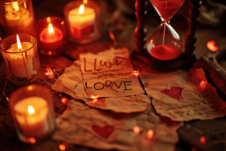 Chemical Affection: The fusion of chemical notations, LOVE, tea candles, and a red hourglass on a wooden surface conveys the concept of love as a captivating reaction
