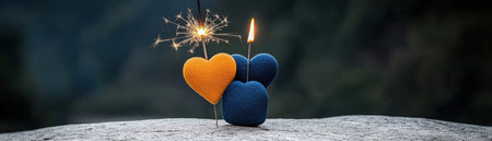 A serene still life arrangement featuring colorful hearts by a sparkler and a candle, symbolizing love and celebration. Perfect for festive themes.