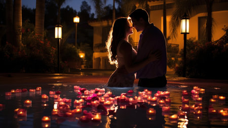 couple sharing a kiss in the pool, with candles and flowers floating nearby.