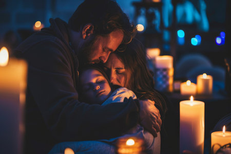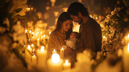 In a tranquil setting illuminated by flickering candles, a couple holds their baby amidst a serene atmosphere. Surrounded by blooming flowers, they share a gentle moment of love and connection.