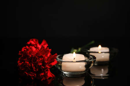 Generative AI Image of Single Red Rose on Wet Floor with Dim Candle Light and Bokeh Lamp