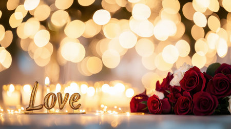 A romantic scene of a rose bouquet gift being handed to someone, with a soft-focus background of love letters and candles.