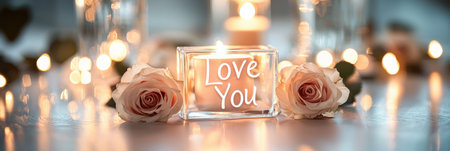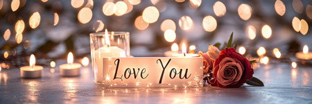 Candle with word LOVE YOU and rose flowers on table, closeup