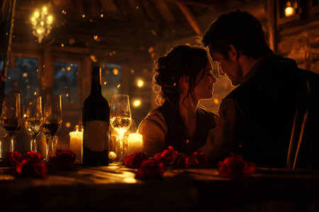 Romantic couple enjoying intimate moments during candlelit dinner, surrounded by roses and wine in cozy rustic setting