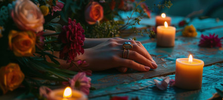 Romantic Wedding Setting: Intertwined Hands with Rings Among Flowers and Candles