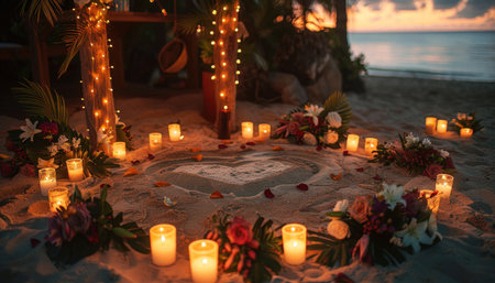 A circle of candles and flowers on the beach at night, creating a serene and romantic atmosphere with the flickering light reflecting on the water