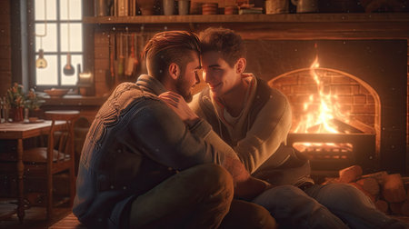Young gay couple sitting near fireplace at home, looking at each other