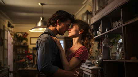 Young man kissing girlfriend in cozy kitchen room. Generative Ai