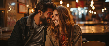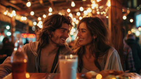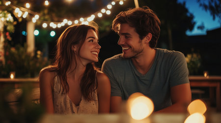 Young couple shares a close, happy moment under the ambiance of warm string lights at a cozy outdoor venue