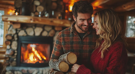 Man and woman with wood near the fireplace, created with Generative AI technology