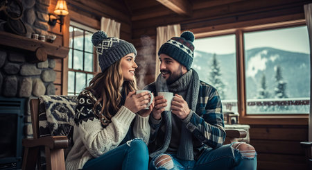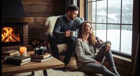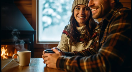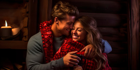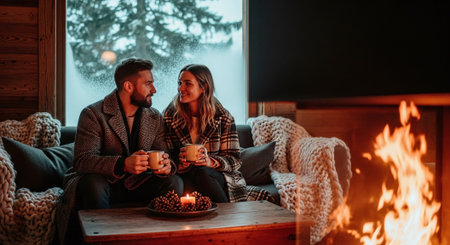 couple in a secluded cabin, wrapped in blankets and sipping hot cocoa by the fire.