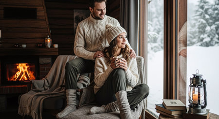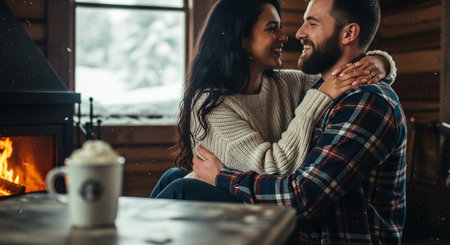 A couple deeply in love sharing a cozy moment in a rustic cabin surrounded by snow covered trees.