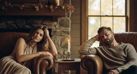 Upset young couple sitting in armchair at home. Unhappy man and woman sitting in armchairs.