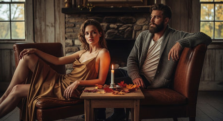 Beautiful young couple is sitting in armchair with autumn leaves and burning candle.