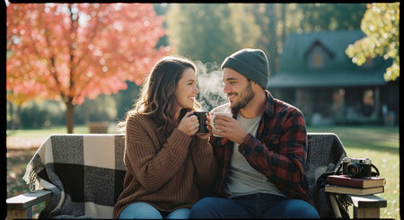 A couple sitting on a bench outdoors, enjoying hot beverages, surrounded by autumn foliage, with a cozy atmosphere