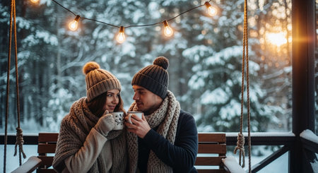 Beautiful young couple is drinking coffee and smiling while sitting on the porch of the house in winter