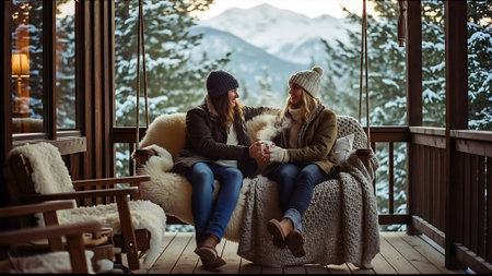 Young loving couple in warm clothes sitting on the terrace of a mountain house.
