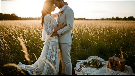 Romantic couple in a wheat field at sunset. Bride and groom.
