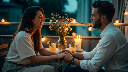 Couple in love holding hands and smiling while sitting on terrace