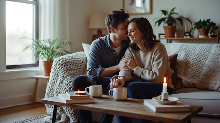 Couple in love sitting at a table in a cozy living room