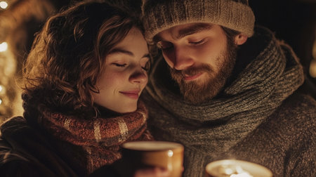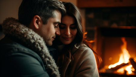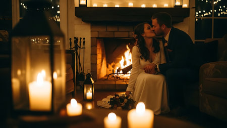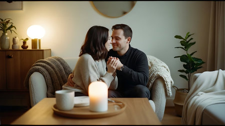 Affectionate young couple sharing a cozy moment by candlelight in a warm, intimate setting