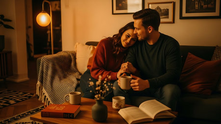 Young couple drinking coffee and reading book on sofa at home in evening