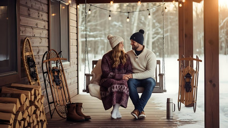 Couple in love sitting on the porch of a wooden house in winter