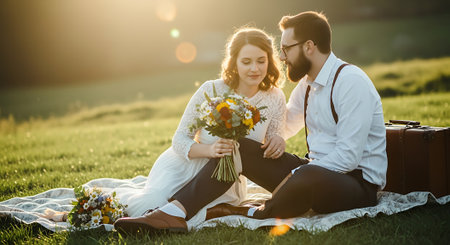 A man and woman sit on a blanket in a grassy field, enjoying a romantic moment together, with the woman holding a bouquet of colorful flowers and a suitcase nearby.