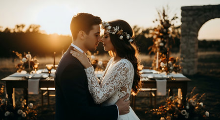 A tender moment between a bride and groom at an outdoor wedding reception, with a beautifully set table and floral arrangements in the background, during a warm sunset.