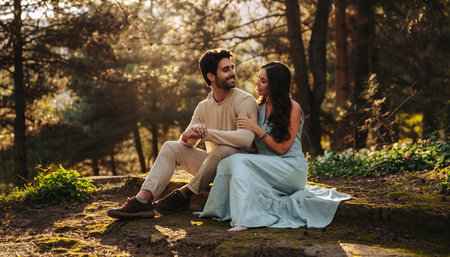 Young couple sitting in the forest and looking at each other. They are smiling