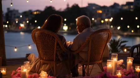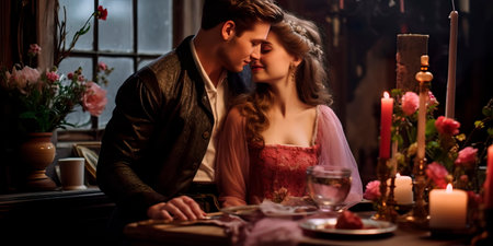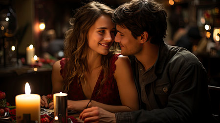 A man and a woman sitting at a table with candles. Generative AI image.