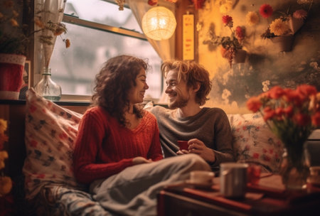 A non-binary couple sitting on a cozy couch, wrapped in a blanket and watching a movie together, with soft lighting creating a warm and intimate atmosphere Generative AI