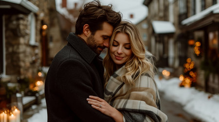 A heartwarming image of a man and woman sharing a tender embrace amidst the snowy scenery.