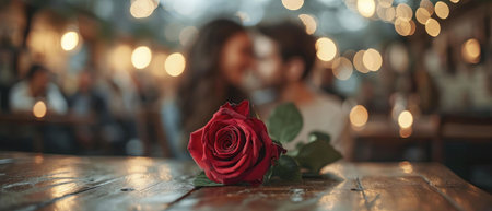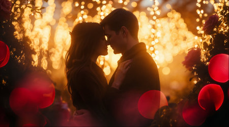 An AI generated illustration of a romantic couple poses against a dazzling lights for Valentine's day